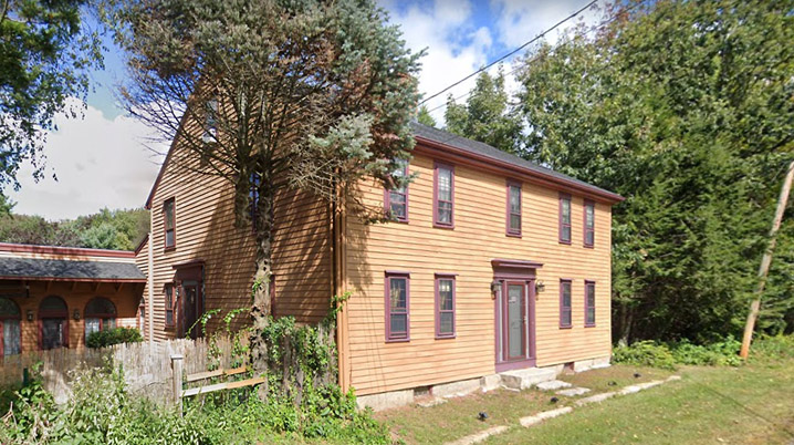 This classic but rundown New England saltbox provides ample evidence of its antiquity. On the roof to the right of the central chimney is a very visible line showing that it was expanded from an original half-house. The “broken back” saltbox roofline indicates that the lean-to was an addition, not integral to the original construction. The upper window framing abuts the beam, rather than providing space for a frieze, as is found in later Georgian and Federal houses. The 1830 and 1852 Dorman maps of Andover show Joseph Holt as the owner. This First Period house is currently in a visible state of decay. Visit Andover Historic Preservation.