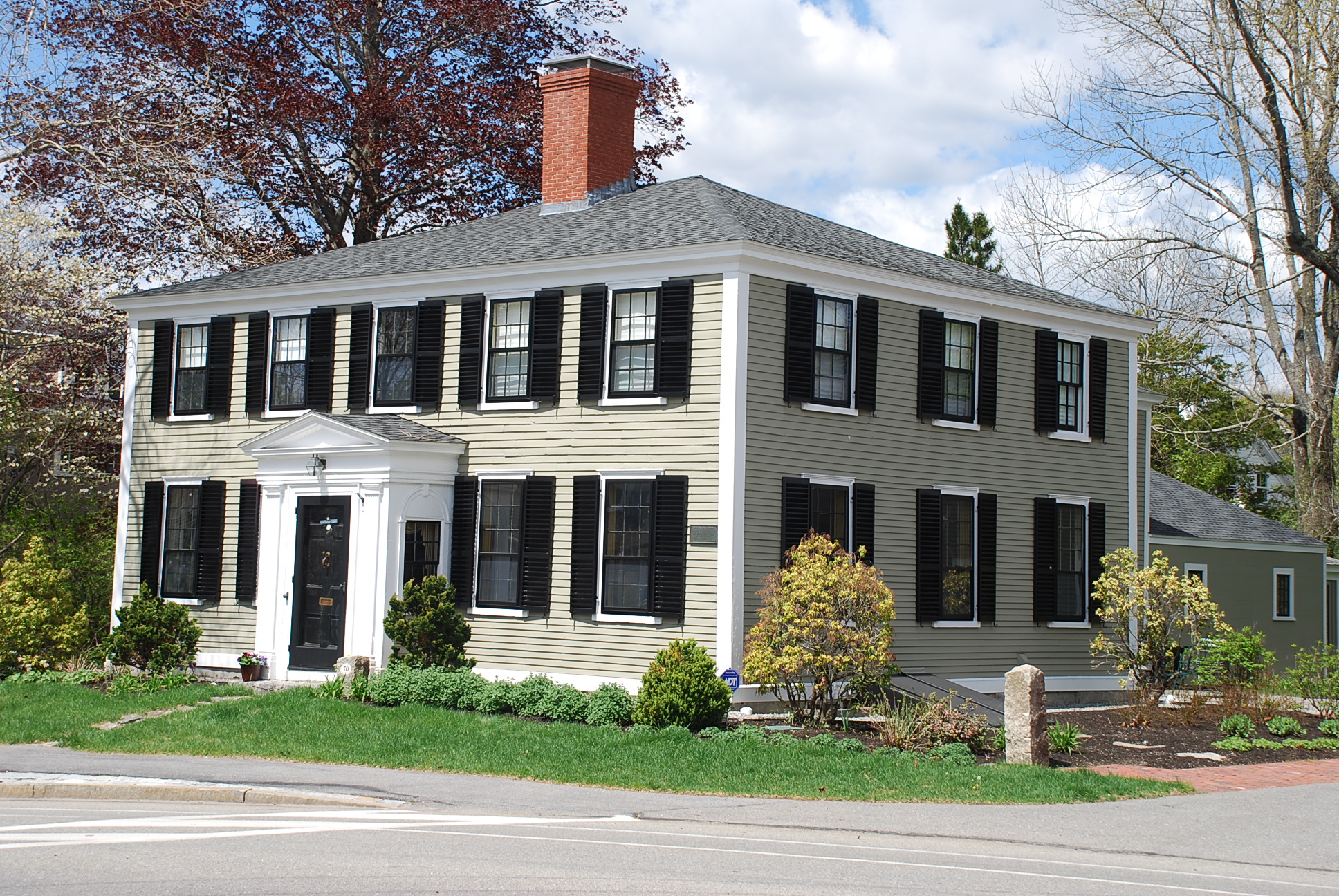 This unusual house has a Federal front façade but an overhanging gable roofed second floor in the rear. Property deeds “with buildings” trace back to when John & Louis Sawin sold a two-acre parcel with a building at the north end of Preston’s Plain to John Herrick on Oct. 16, 1778. Alfred Poore’s History of Andover, printed in 1863 states there was an earlier house at this location was dismantled and removed: “Now this part of it is the cottage of Dr. Whiting’s place, and one part is incorporated into the lower story of Mr. Goldsmith’s house, and was removed there when the house was taken away about 1790.” Read more at Andover Historic Preservation.