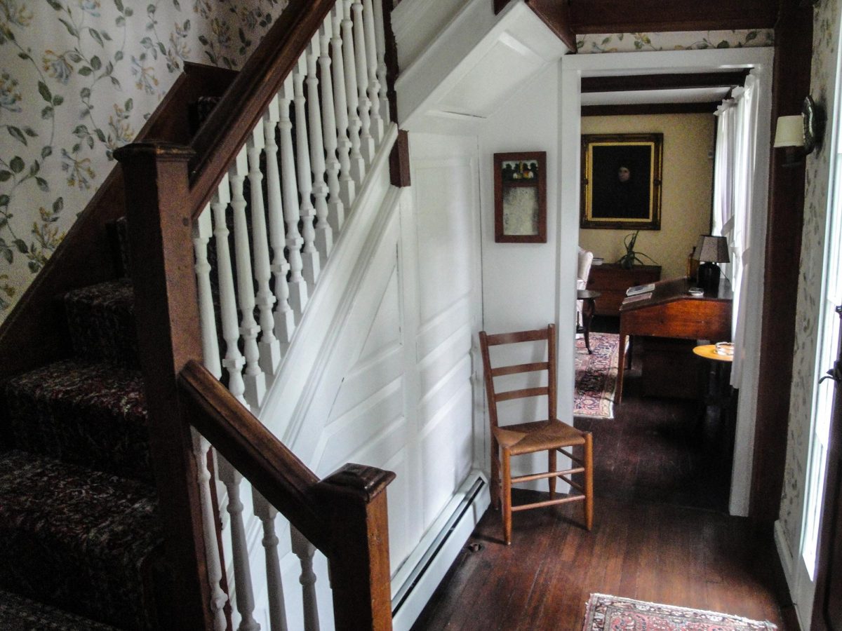 The stairs from the first to the second floor and also up to the attic, are still in their initial location in front of the chimney. The staircase is typical of the late First Period, with turned balusters, but a plain newel post. Molded paneling under stairs makes it clear that there were never cellar stairs there. A trap door to the root cellar also exists under this half of the house. The staircase was probably a double run with landing, originally. The current unusual configuration was most likely created when the chimney was rebuilt and narrowed. An empty space was left behind the chimney and it was logical to use this as an easier way to reach the rear chamber.