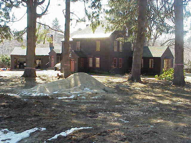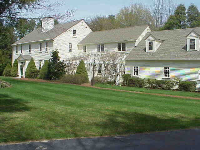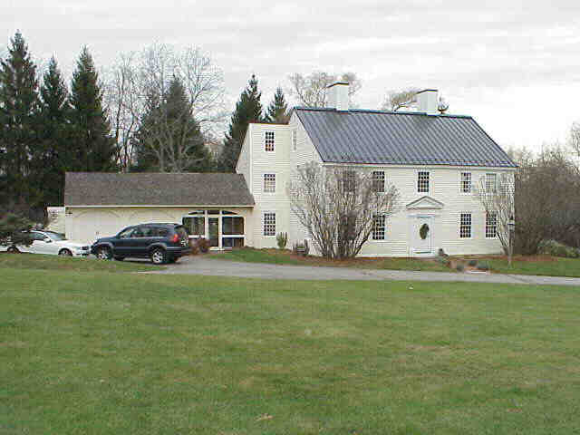 BOX.64, Sawyer House, 21 Endicott Rd, Boxford MA r 1715: The Sawyer House, built in the first quarter of the 18th century, may have begun as a single-cell house that was enlarged to a 5-bay, central chimney, lobby-entrance, two-story, double-cell structure, as the principal rafters show evidence of collars on only the left side for the principal and purlin system. The right side appears to be the earliest core of the much-enlarged house. The house was apparently built on land formerly part of the Gov. Endicott grant of the 17th century. Sidney Perley assigns the date of first construction to Stephen Gould ca. 1750. The farm was later owned by the Kilham family until 1802 when it was purchased by Dr. George Sawyer. It was in the Sawyer family until 1940, during which time it acquired the Mt. Vernon-like portico.