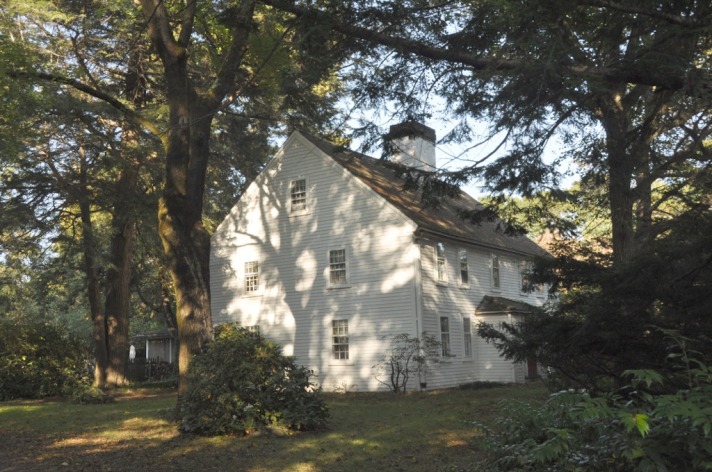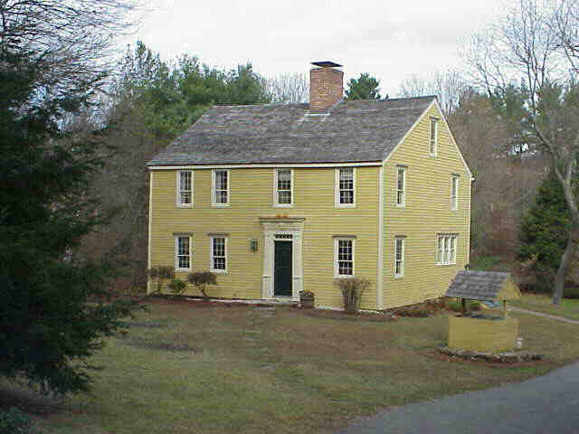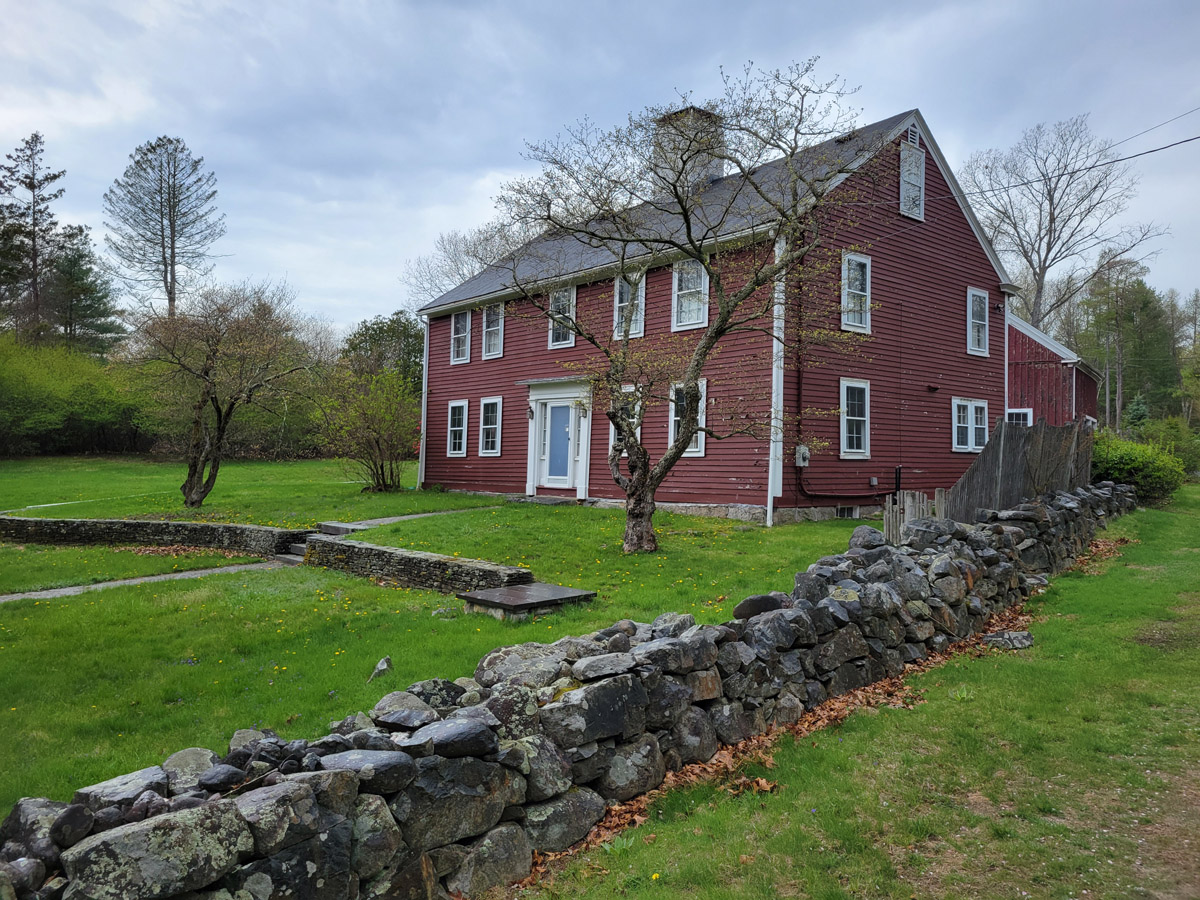 BOX.33, Abraham Redington House, Main St, Boxford MA 1683: This house contains portions of the 17th-century core dating back to the first settlers of Boxford. Robert Stiles drew Lot No. 3 on which his house was built, and the large east side is the portion of the 1683 house still present. It was a “half house”, common in that period, 20 ft. by 20 ft, with the chimney on one side, so that the house could be later completed in the center chimney style. In 1760, Abraham Redington (fourth generation from the town’s original settler) added the two rooms west of the chimney. He did not make it symmetrical, however, – only one window above and below on the rooms he added. Investigations have shown that the early oaken planking, vertical and pegged, ends beside the front door in contact with horizontal boarding on small studding for the west rooms added In 1760. At that time he also enlarged the leanto kitchen to give it the present saltbox appearance. He was a housewright by trade. The original 20 x 20 room was used as a schoolroom in the 1800s for a time before the local schoolhouse (no. 2) was built across the street. (from MACRIS)