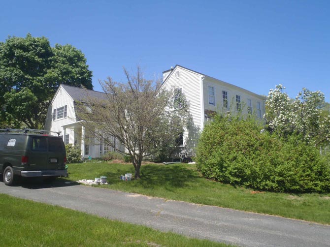Balch, John house 1 Hill St c 1769 TPF.174: The John Balch House is one of Topsfield’s few eighteenth-century gambrel-roofed houses. The original house is 2 1/2 stories, five by three bays, with a pair of massive ridge chimneys. Its configuration today, however, is a true New England “connected farmstead”, having grown over the years by the addition of a two-story northwest wing, connected to what appears to be a small 1 1/2 story cottage with a wide wall gable on the facade, and, abutting the end of the cottage, a handsome “New England” barn of the second half of the nineteenth century, with its main door in the gable end, facing the road. This house is an excellent illustration of an old farmhouse which came down through five generations of one family, in its early years serving as a double-house for different family members, subsequently functioning as a single-family residence, and later becoming a summer country estate for the twentieth-century owners. It was built for farmer John Balch in about 1769, on land that had come into his family in the 1722 division of Topsfield common lands. In 1771, he referred to it as his “new house” when he conveyed the western half of it to his son, John Balch, Jr. (1742-1798). Shortly thereafter, his youngest son, Roger Balch, received the eastern half of the house from his father.